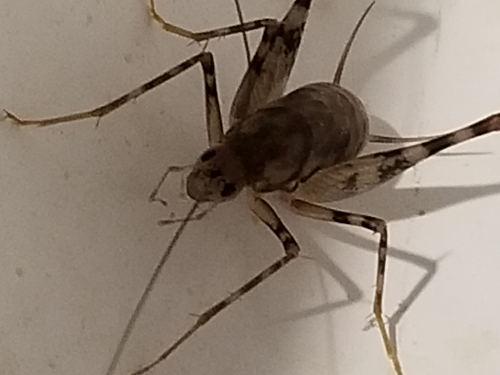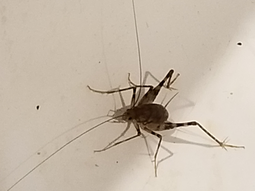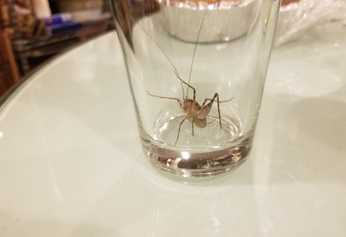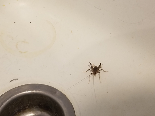 I believe this is called a jumping cricket. Mostly he (she?) was hanging around in one of our kitchen sinks. We didn’t disturb her (him?). She went out of the sink once or twice but always came back. Not sure what he was living on…