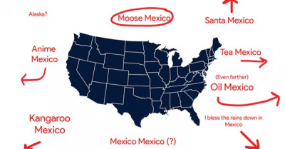 The “world map” displays the USA at its center. Then, it has arrows pointing in the general direction of every other country. All of them are called “Mexico,” though each name has been embellished with a helpful descriptor to distinguish all the Mexicos from each other.