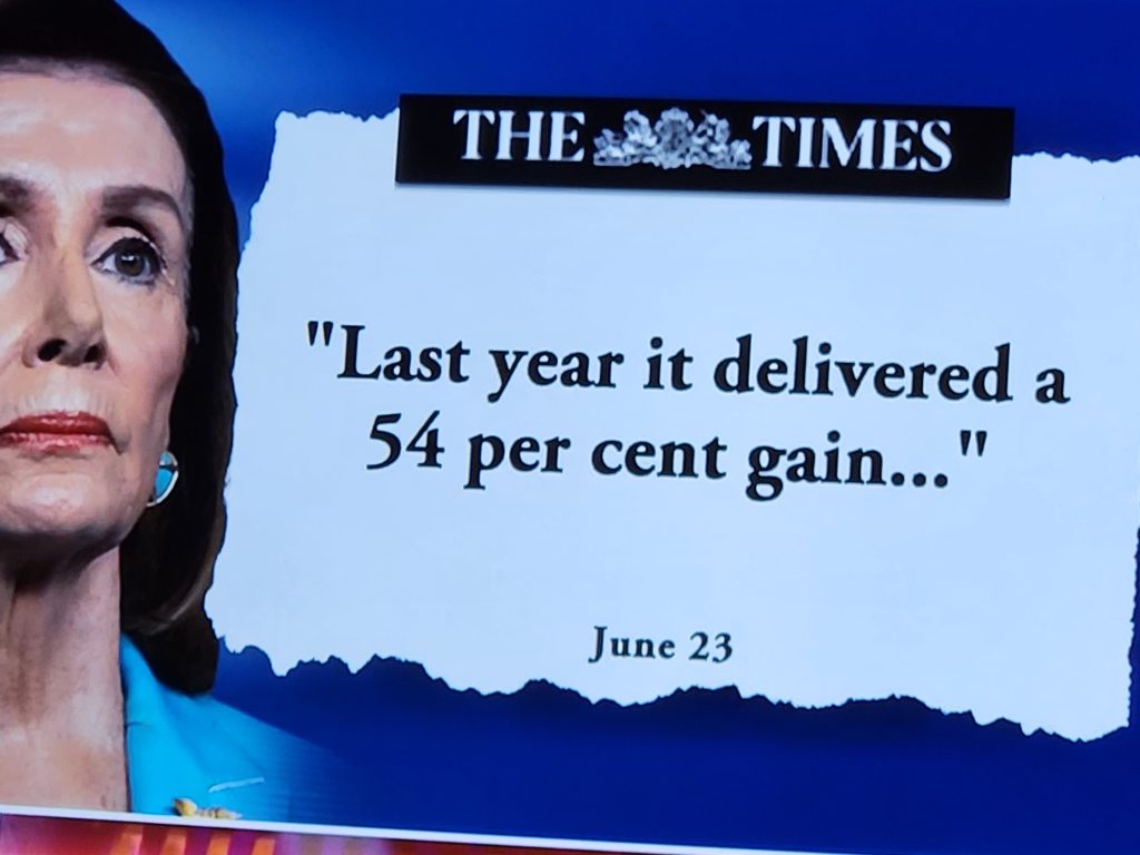 The investment acumen of Nancy and her husband is truly something to behold. Here’s some data from Yahoo! Finance and The Times of London. And below the pictures, a NY Post article.