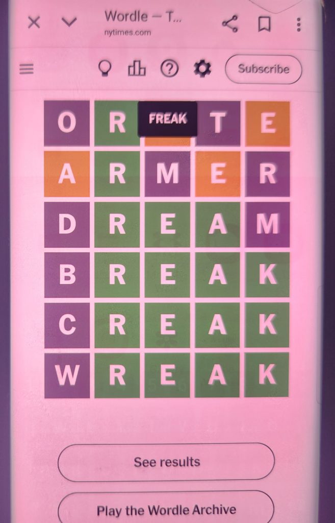 Not counting the day I missed doing wordle I’d gotten 65 in a row. So – will start new streak.