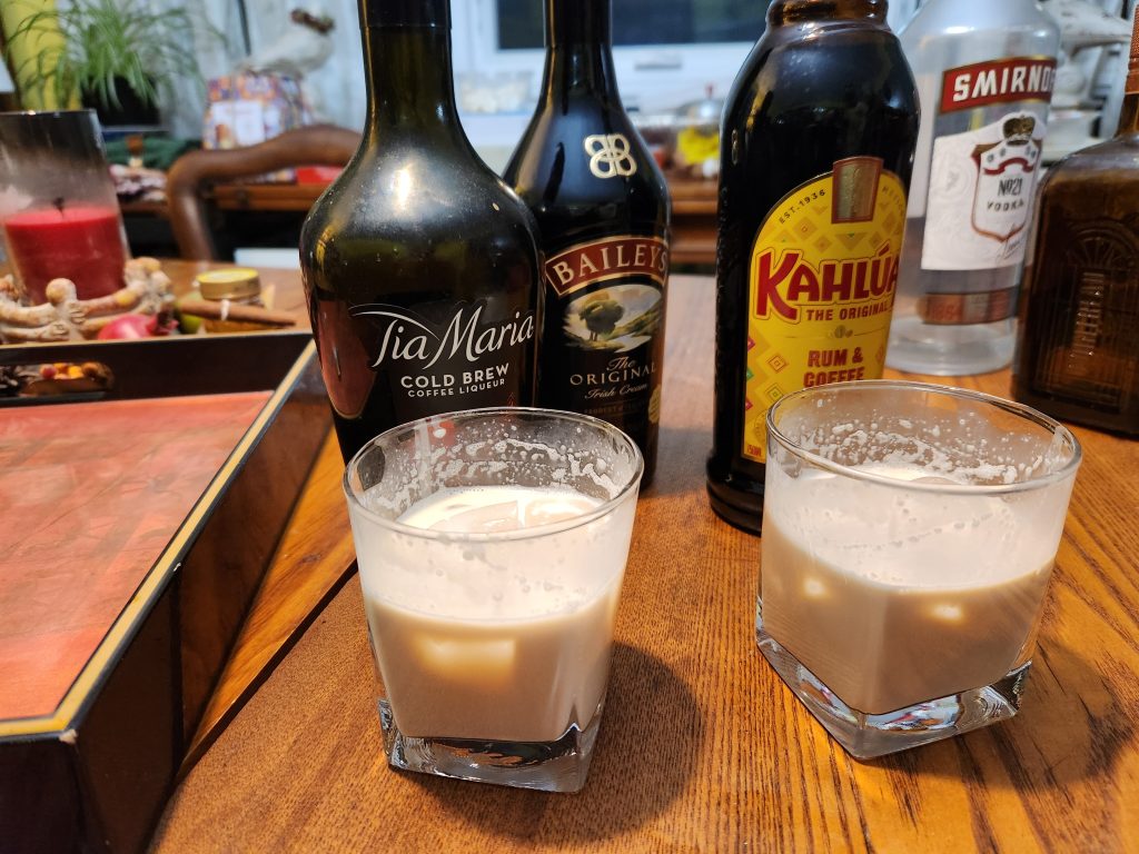 Pour the contents into a glass, add ice and stir. We don’t do the “chocolate garnish” but I’m it can add to the taste. We will try subbing a chocolate liqueur for the coffee one, and also sub in the Mr. Black coffee liqueur which is more coffee and less sweet.