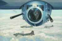 The ball turret is the one on the bottom of the B-17, shown above. Usually a small man, jammed in. A horribly dangerous place.