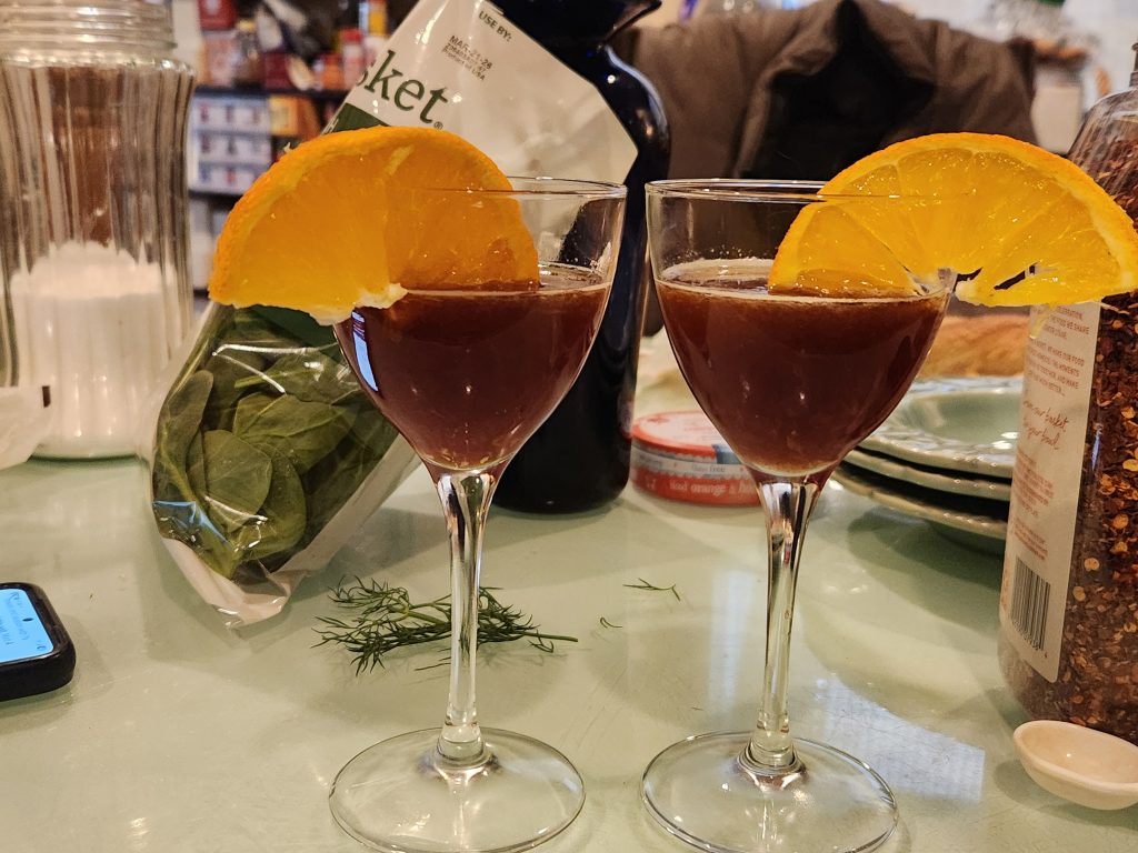 Shaken with ice; we garnished with the orange slice. Results: Brigid “Ok”, Tom “Meh”. Here’s our picture – note the color is very close to rust. Some people love it so give it a try. It is recommended to avoid scotch with a strong peat flavor despite what Steve the Bartender ends the video saying.