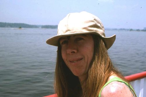 On the escarpment in the Catskills with her friend Linda Knox in 1986. They are right at the edge with a straight drop of hundreds of feet behind them