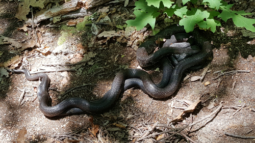 On the way back down, on the trail between the two mountains were two black rat snakes, gaining the attention of hikers as they seem to be trying to start a family. I watched for a minute or two and no kidding, every few seconds you could hear a kind of purring sound.