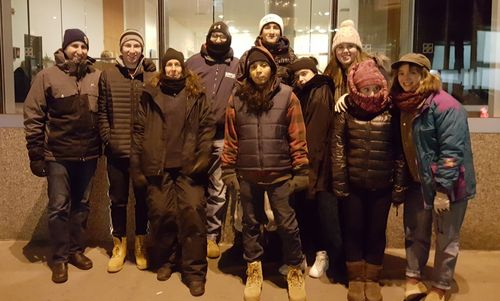 Here are the intrepid, bundled up Midnight Runners brought in food and clothes. This is the Citicorp building stop where there were about 30 people, who were sheltering in St. Peter’s ELCA Church, which is right behind them. The young lady on the right evidently didn’t get the “wear brown” memo.