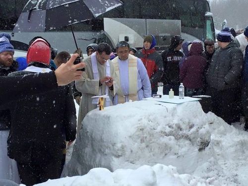 Equipped with his travel Mass kit, an altar of snow was built as hundreds congregated outside in the cold.
