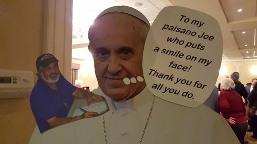 This is from last Thursday’s dinner honoring Joe for his last four years as the Knights of Columbus local Council’s Grand Knight. And Joe and Gina are a big presence in our community and our Parish. Or as Mike Reynolds, our new Grand Knight says, our “leader.”