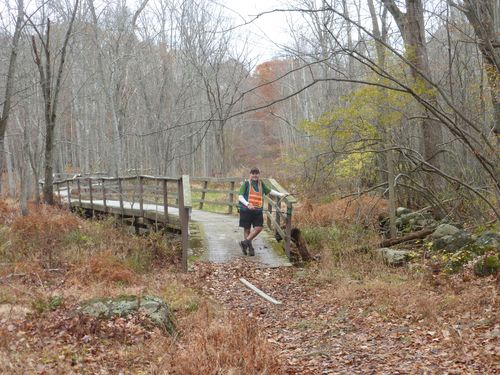 And further south out of the Blue Mountain area, there was a nice wooden bridge over a marshy area on the trail. Since it was the first day of hunting season we both had orange vests … Jeanne Marie had taken hers off for lunch at the top of Spitzenberg.