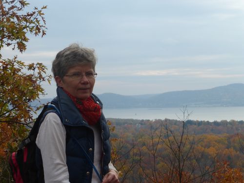 Here’s Jeanne Marie at the top of Mount Spitzenberg (540 ft) and the view is west across the Hudson.