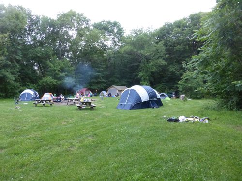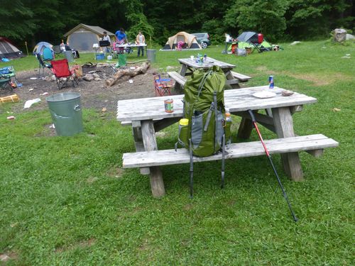 On to the campsite. It is off Dennytown Rd., and the trail guidebook said it was open to groups and individual hikers – and had “latrines and water.” My assumption was that “groups” meant hiking groups, but I was wrong! There was a group up for the weekend from the South Bronx. I was the only hiker. Everything was fine, except for the (loud) music til 2:30 in the AM. That’s my stuff in the lower right hand side. I had no tent or sleeping bag – used this bivy sack which worked fine along with this sleeping pad Therm-a-rest Z lite.