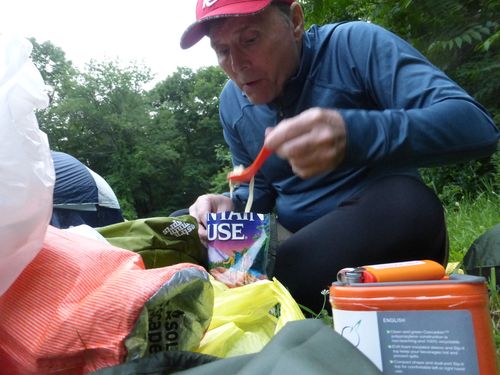 The backpack is an old EMS (Eastern Mountain Sports) “Trail 50 Mirage” which I must have bought new, a few years ago. It’s Ok; hip belt fits me quite well, but whole rig is a little heavy and a couple of annoying straps which I can’t figure out the use for. There’s actually one selling for $66 on ebay right now. Same color. My shoes were New Balance Trail Runners. You give up support, and the soles are not very thick – you feel it if you step on a pointy rock. BUT they have a non-slip sole and very light. Very light is very good, for me anyway. I had the two step aquamire water purification tablets with me, but didn’t need them.
