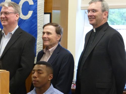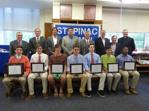 Here we are with Fr. Collins, the President of Stepinac, who I believe graduated ten years after I did. And below that, a group picture (indicating that not only am I the oldest of the alumni Dads, but also the shortest!).