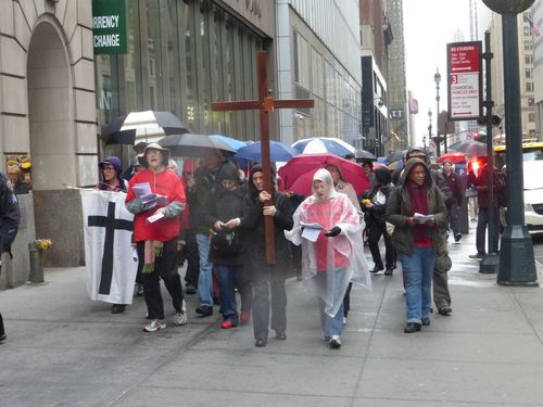 On the good side, it was a relatively balanced group, age-wise. Some of the Catholic high Schools are starting to get small contingents out. For example, Fordham Prep (Joe’s alma mater) had about ten and they did a Station on healthcare. Dr. Carney, from their religion department, promotes the event. And Marymount School had a great Station on human trafficking, while Christo Rey School did the last Station with the theme of fighting violence with non-violence. Excellent. And as always, some of the Stations were pretty forgettable. Nobody bats 1,000.