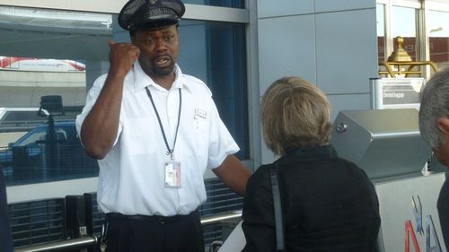 Sidewalk check-in for the American Airlines direct flight to Manchester. Brigid will then hop a train for a couple of hour ride to York.