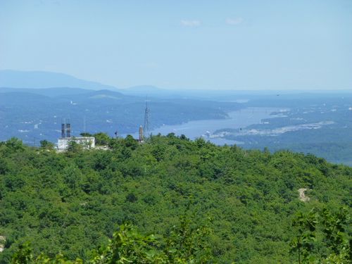 Below, looking southwest and zooming in; the crest just to the right of center of the picture is Storm King, on the other side of the Hudson. Storm King is facing Breakneck Ridge – you can see the lush green back of Breakneck.