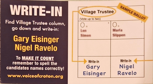 Croton is a one party – village, there is no organized republican party. I was never interested in local politics UNTIL the last couple of years as the five elected officials decided what Croton needs is urbanization. This has spawned a serious write – in campaign for the two trustee positions that are up for election. There are actually vastly more yard signs up for the write – in candidates than for the two incumbent Democrats – including signs in yards which also have Harris / Walz signs. Nevertheless a very long shot for them to win – I will be writing in.