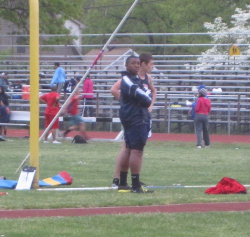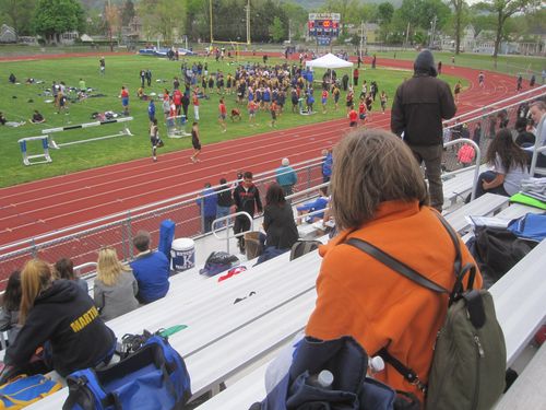 Here’s a long shot of Tim with his friend Liam (a pole vaulter and football player) in Beacon, and below that is the faithful Brigid, watching as the schools get ready for a series of relays.