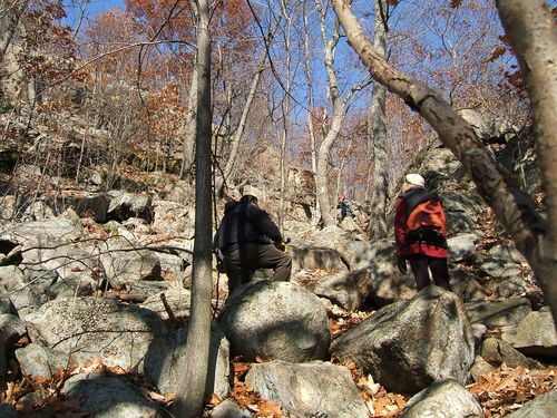 OK, here’s one picture from the A.T. November 30, 2007. That’s Brigid nearing the top of “Agony Grind”, across the river and miles west of Bear Mountain. You can just make her out. In the foreground are Mike and Karen Riner (Mike with the much larger behind). This is an exceptionally difficult part of the Trail in NY.