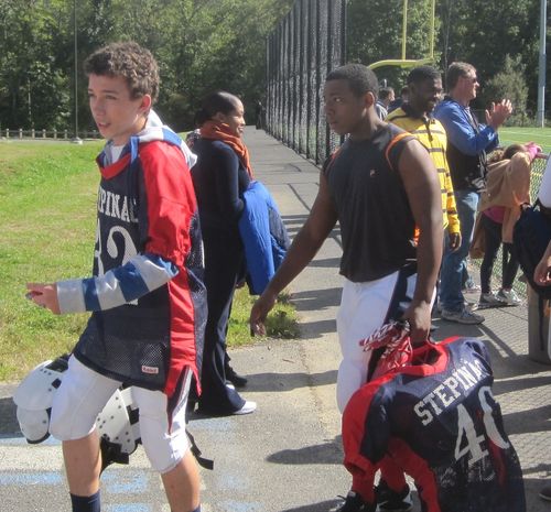 This past September, after his first freshman football game, as Stepinac frosh beat Cardinal Hayes, 28-6. Tim started at fullback & linebacker & kicked off & punted! That’s his friend Chase, #32.