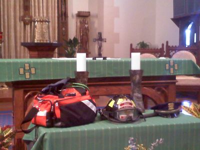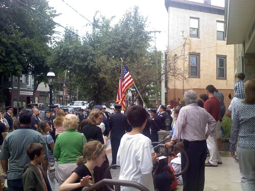 Two pictures off my verizon phone – the altar with symbols of first responders in the foreground and a small crucifix made from metal from the World Trade Center. Then a shot outside of the short ceremony after Mass. You can’t see all the people – it was a very good turnout.
