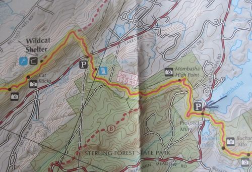 Here’s the Appalachian Trail map (#2 of 4 on the NY/NJ series) showing the trail I walked the first day, from West Mombasha Rd. to the Wildcat Shelter. The prior five miles, east of the West Mombasha Rd. Brigid and I had day hiked along with Mike and Karen Riner, way back in December ’07.
