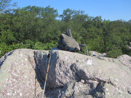 And I had too much other auxiliary stuff. 100 ft. of paracord, too many plastic bags, too big a first aid kit, an unnecessary hat for wearing while sleeping, and other impedimenta. By eliminating the unnecessary stuff, one of the sleeping pads, and my hiking boots, that’s a good six lbs. Doesn’t sound like a lot, but in 90 degree plus heat, it is.