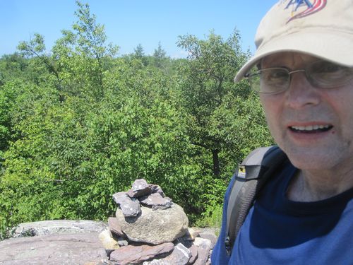 Good walk, but wow, it was tough. More to follow, but here I am earlier about three miles north of the NY/NJ border at about 1,375 feet. Glad I got the cairn in the background.