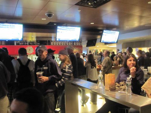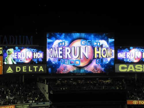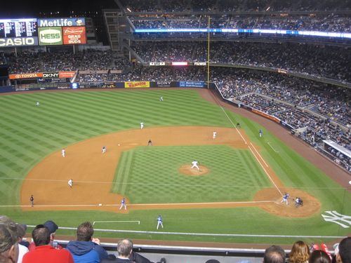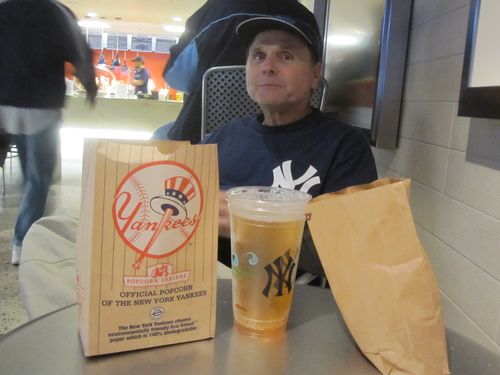 Good thing too, because it was raining/drizzling. Anyway, we get into the bar and right away see two friends of ours, Rich and Pat Santana, who we hadn’t seen in a couple of years. So that was cool. We stayed in the bar drinking beer and eating popcorn and peanuts until the fourth inning, because of the wet. By then the Yanks were ahead by about 7-2, with CC Sabbathia pitching.