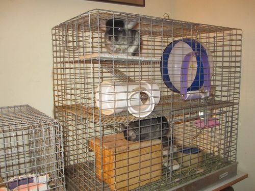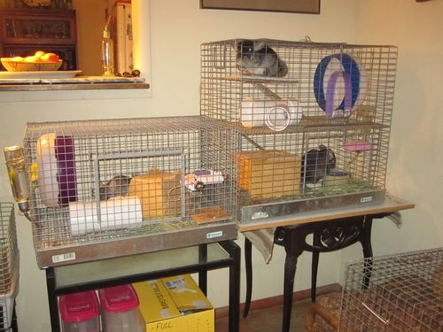 Here’s the three of them – you can see Dusty in her own cage. Chili is at the feeding trough and Gloria upstairs. Dusty and Chili’s cages are close enough for them to rub noses, but that’s all they rub, even when they are together.