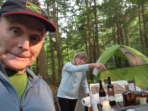 So Thursday we ate dinner in our campsite, had a good bit of some wine and continued expanding the legends-in-our-own-mind we have of ourselves. Then earlish on Friday Laurie and I drove around the extensive campsite, scoping out the many hiking trails running through the site. In fact we came across a mixed group of students entering Cornell in September. They were offered some bonding (!?) opportunities by Cornell before they were scheduled to arrive at the College and this group decided on a four day hike that ended at the Putnam Pond site. We had an nice brief conversation with them – I told them my brother Paul had been a cox on their crew teams for the four years he was at Cornell – they were very mildly impressed…