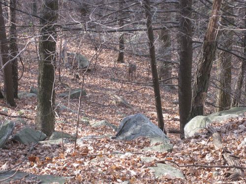 Now west of Rte 52 and two shots of one of the very few animals I saw. In fact, I can’t recall seeing any other animal at all. This deer must know there’s no hunting along the Appalachian Trail! I was on the Trail about forty vertical feet above the deer and probably around 110 feet away. In both pictures the deer is just about smack in the middle.