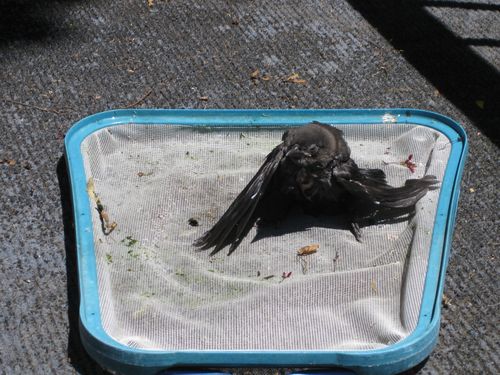 For years we’ve had Grackle nests in the trees around our back yard. And every year, around this time, baby Grackles end up drowning in our pool. This despite our best efforts.