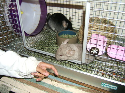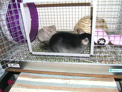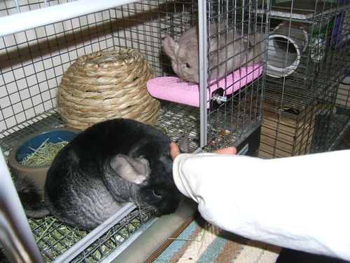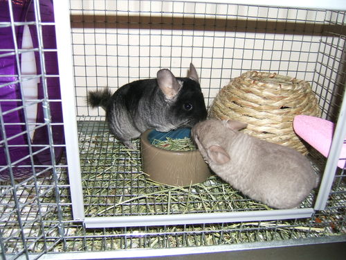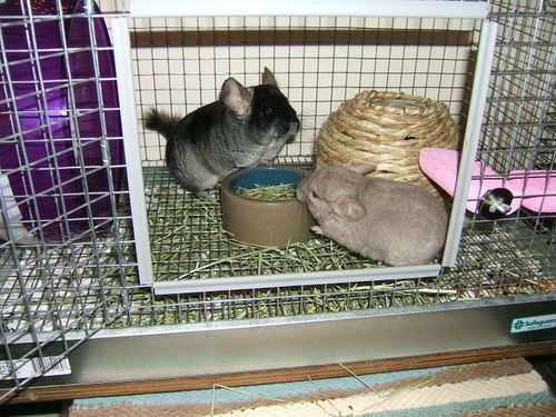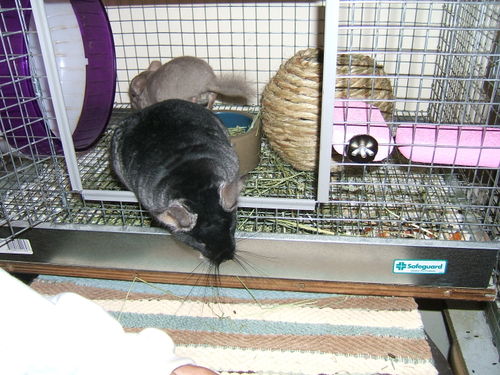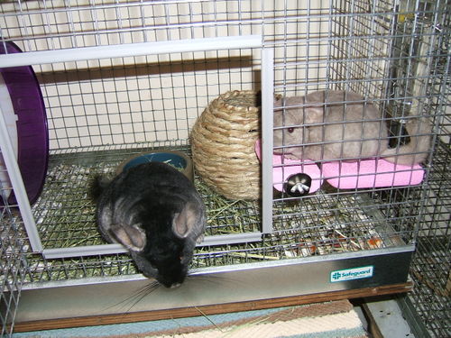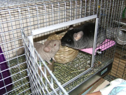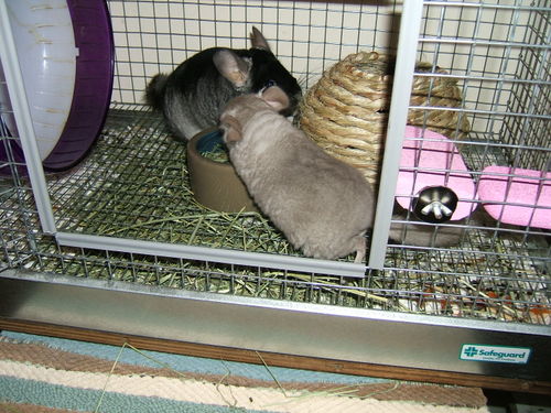 As posted here a few days ago Newcomer to Farandaville, we now have a second Chinchilla. Brigid and Joe and Tim decided to introduce the two year old Gloria, to the newcomer, whose name now seems to be Dusty Snowball (Tim insists on the Snowball part) by putting Gloria in the cage with Dusty. This is actually the second time they’ve done it, but the first time I’ve seen it. Last night they had a sand bath togther, but Tim and I missed that – we were doing a Midnite Run to Manhattan.