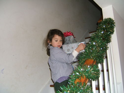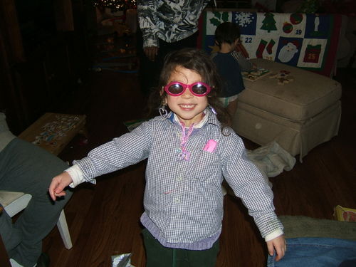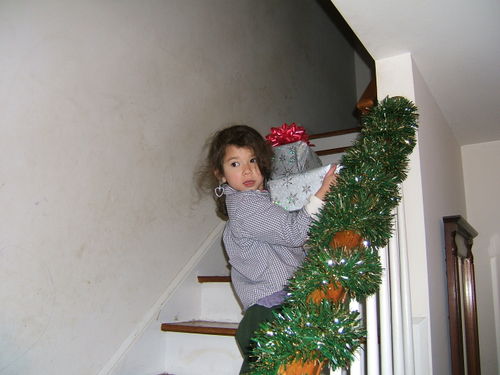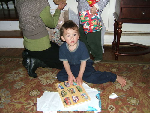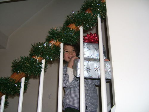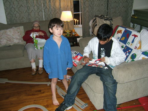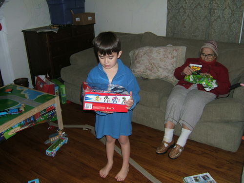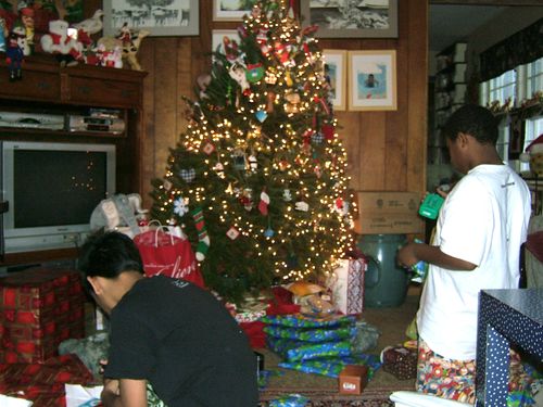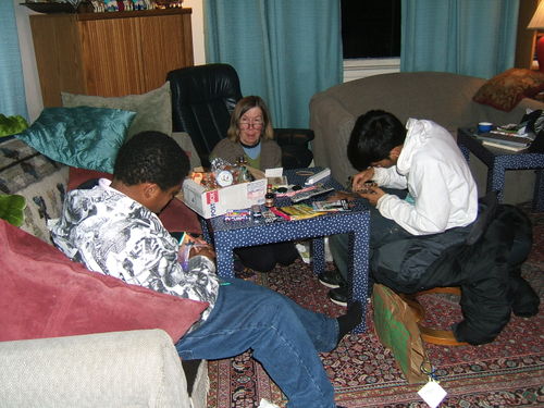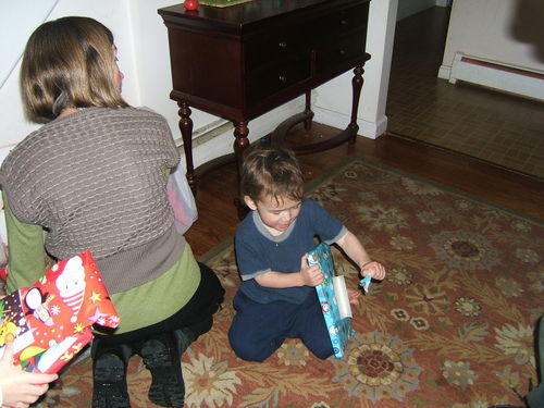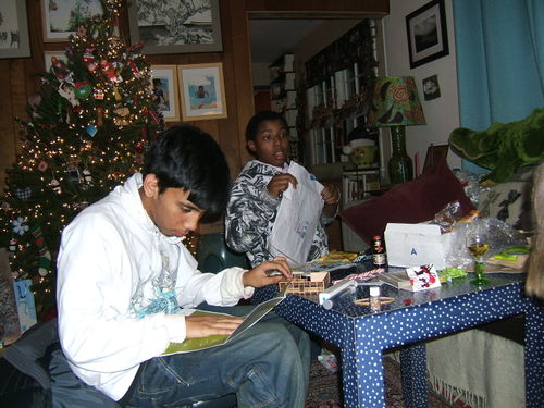 Joe loves to build things and he received this small house from Australia, while Tim unravels an England present. The tree in teh background looks a little askew, because it is! Earlier in the evening, I suddenly heard a “swoosh” and when I walked into the room the tree was on it’s side. It just fell over of it’s own accord. A repair job was done, but it still has a stoop…