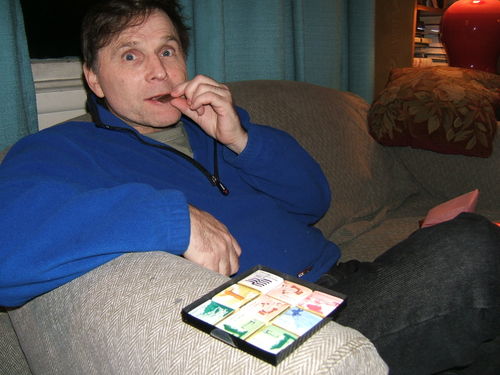 … and I eat a delicate French chocolate sent by the DSIL (that’s dear sister-in-law) Kate …