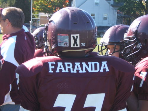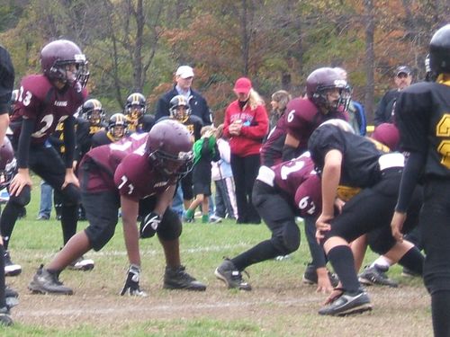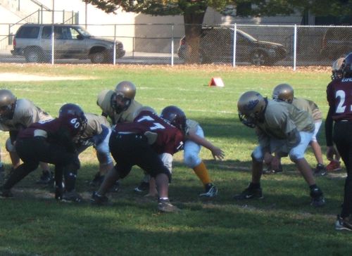 On the defensive line – check the size of the Yonkers boy to Tim’s right! 6th grade? Did he drive to the field? But Tim did well when he was head to head with him –