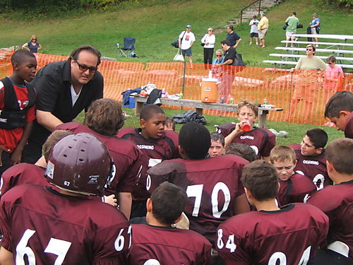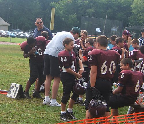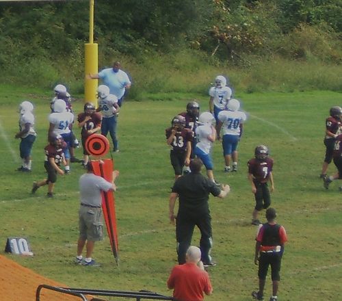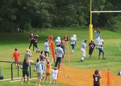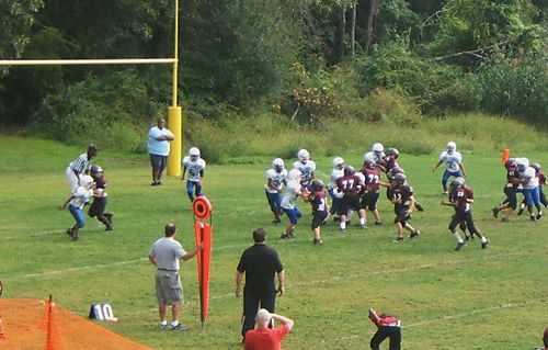 Here’s a picture of the play where Ossining scored their touchdown. It’s just dumb luck that I took this. The play was a halfback option pass (they really do these sort of plays at the 5th/6th grade level) and you can see the receiver running his pattern to the left of the picture. Tim is to the middle right of the picture, barely visible as he shoves the defender back about five yards!