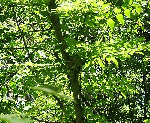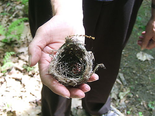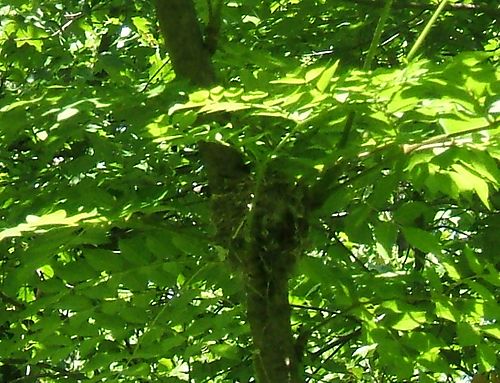 Maria does a bit of bird watching, and somehow sited a nest with young birds and dutiful parents, just off the trail, next to one of the cemeterys. This is the best we could do photographing the nest, which is right in the middle of the next two pictures –