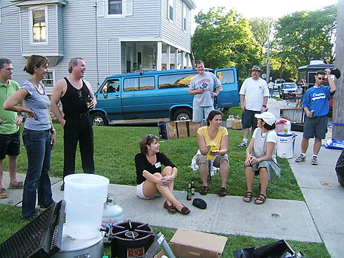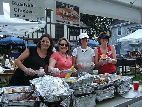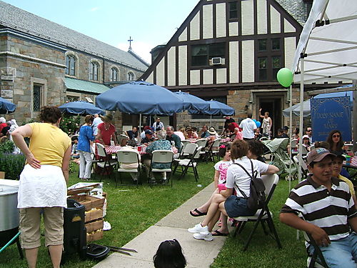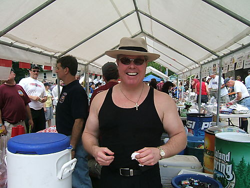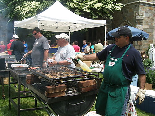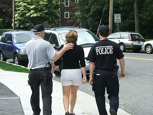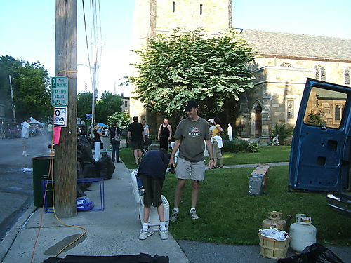 And here is “Da Boss,” Lori Vlad, being led away by two Croton policemen, very early in the day for rabble rousing! Well, no actually she had to go talk to them about something or other … Lori is actually the boss for the day, with overall responsibility for the big HNM food operation and three or four other Church exhibits.