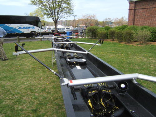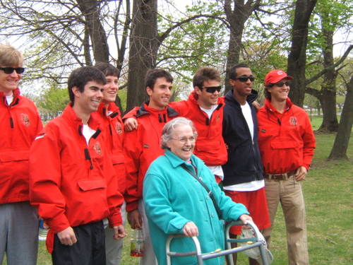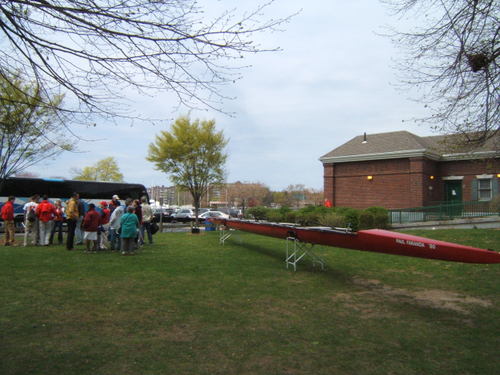 The boat was rowed on Saturday by the junior varsity. They were photo’d with my mother (she turns 82 tomorrow), who got a big kick out of it …