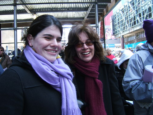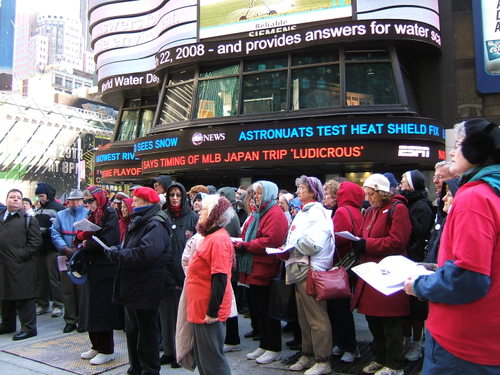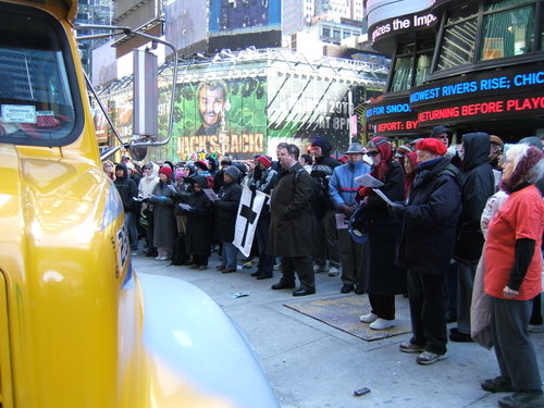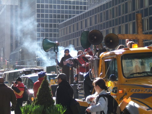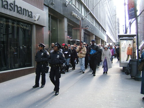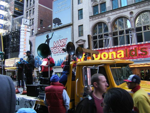 This time I went down with Judy Anderson, and we arrived for the fifth station, in front of the Daily News building. Each Station always blends in a contemporary theme and meditation; some are sublime and excellent. A Catholic girls school from Staten Island had a good one on the abuse of women. Catholic Charities had an excellent one (in front of the world’s biggest McDonald’s) entitled “amusing ourselves to death.” Of course others are also inane. Right after a station on the genocide in Darfur, the next station was about “genocide on our city streets.” But you gotta take the good with the bad…