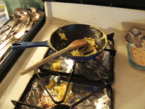 The travails of being 14 years old. Yesterday Joe decided to try his hand at scrambled eggs and bacon for himself, Tim, and Brigid. (I passed; still suffering from gastritis.)