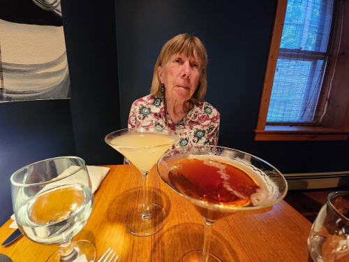 And this is our Saturday evening meal before departing Sunday, at Moya the #1 rated restaurant in the town. Excellent! My drink in the foreground is a bourbon manhattan while Brigid had a peach martini. Same size drinks, distorted by the wide angle.