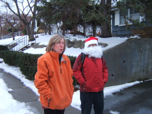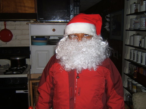 Here’s some shots of Tim in his Santa outfit, as he headed to school this morning. I think he’s a dead ringer for Santa, although perhaps Santa with a tan?
