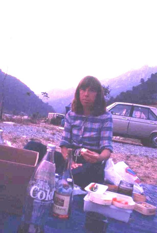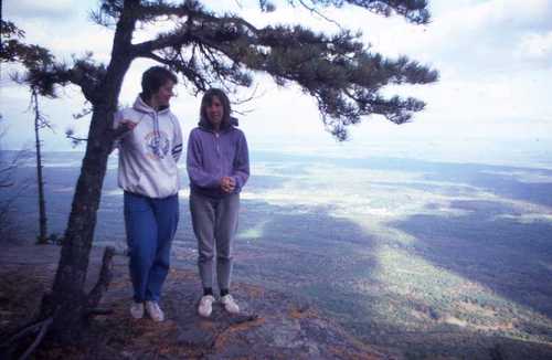 On the escarpment in the Catskills with her friend Linda Knox in 1986. They are right at the edge with a straight drop of hundreds of feet behind them