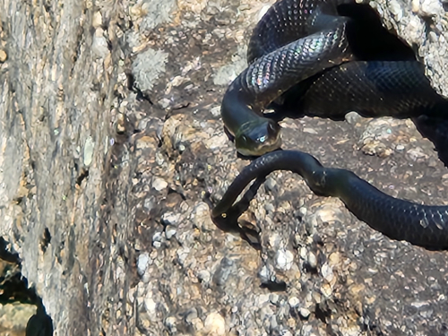 After a few minutes gawking at the rattlesnake I looked up and there under another ledge about 20 feet away and between Brigid and myself was the blacksnake!
