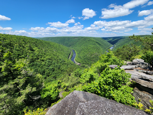 Saturday we did a 3.6 mile hike on the Tank Hollow Trail, north of the town. Nice easy to moderate hike ending in a lovely view of the Lehigh Gorge. We knew from comments on the AllTrails website that rattlesnakes regularly sun themselves on the rocky outcrop you stand on for the view. And as we hiked in, one man leaving and a couple also leaving said there was a rattler and a black snake (looks formidable but harmless) at the outcrop. And before we got to the outcrop we came across this guy – a garter snake – size comparison (he/she was small) you can see the tip of my trekking pole –