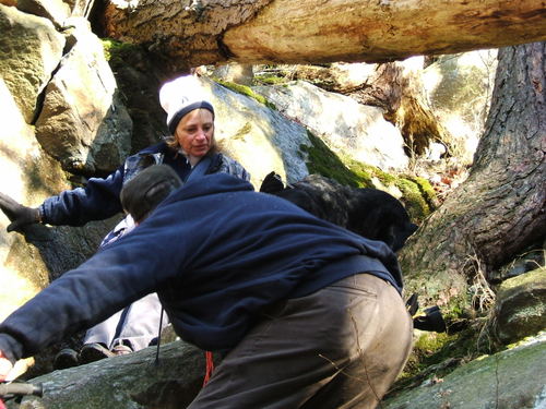 She’s looking at this scene, as Mike and Karen struggle to get Emmy down a tricky spot! Emmy got tired as the hike progressed. Being doggish, she probably walked twice as far as we did, with all the going back and forth!