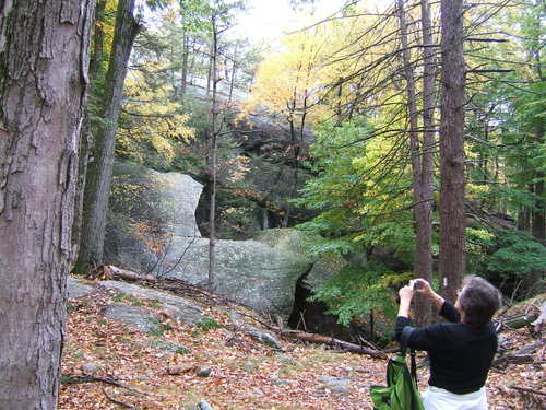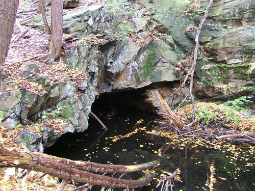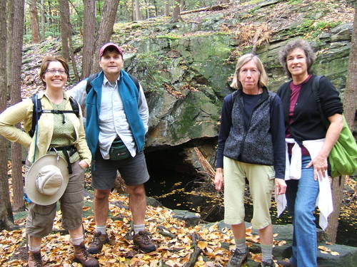 The walk was not difficult, with the exception of a bit of unelegant scrambling at the Lemon Squeezer. There’s lots of interesting stuff. For example, here is Maria, Tom, Brigid and Kathy, photographed by Karen, in front of the now flooded entrance tot he Greenwood Iron Mine, a mine that supplied the iron to make the Union Parrot cannons in the Civil War. The Parrot brothers owned the company and no doubt made big money supplying the North with their artillery.